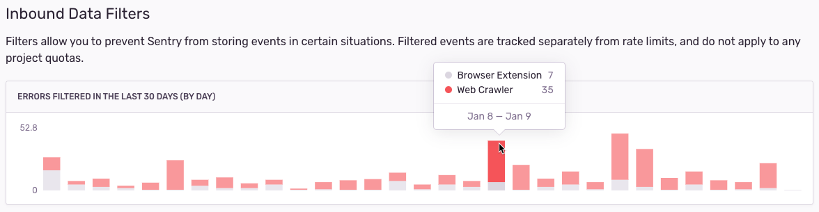 Once applied, you can track the filtered events (numbers and cause) using the graph provided at the top of the "Inbound Filters" page.