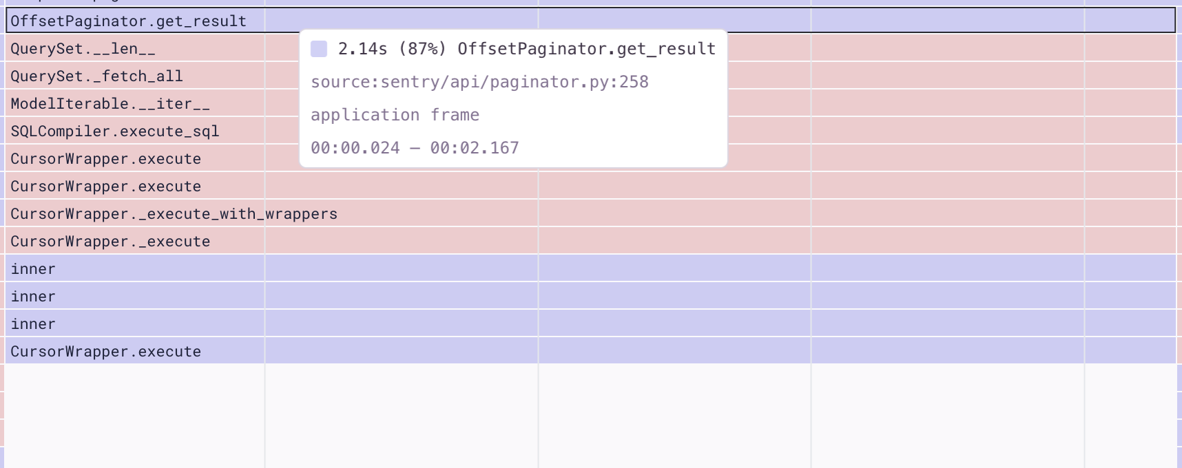 This image shows a section of a flame graph, starting with the function OffsetPaginator.get_result
