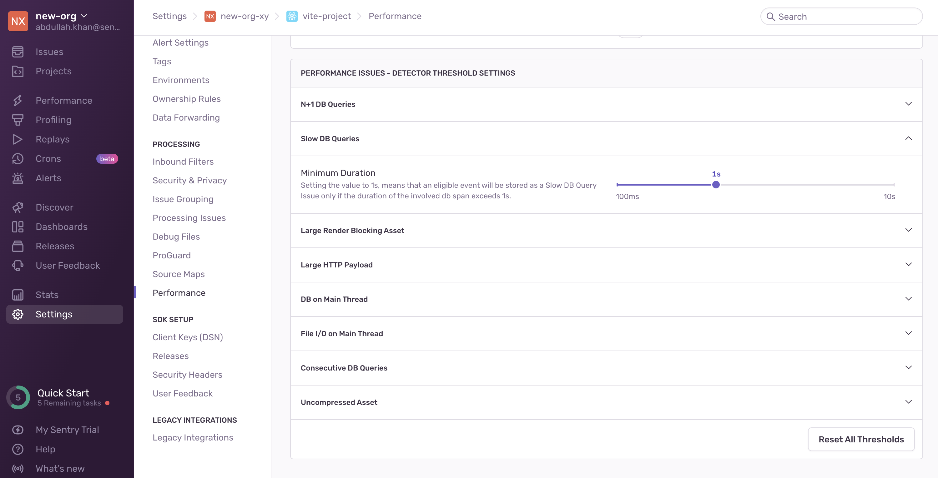 You can configure detector thresholds for Slow DB Query issues in Project Settings > Performance: