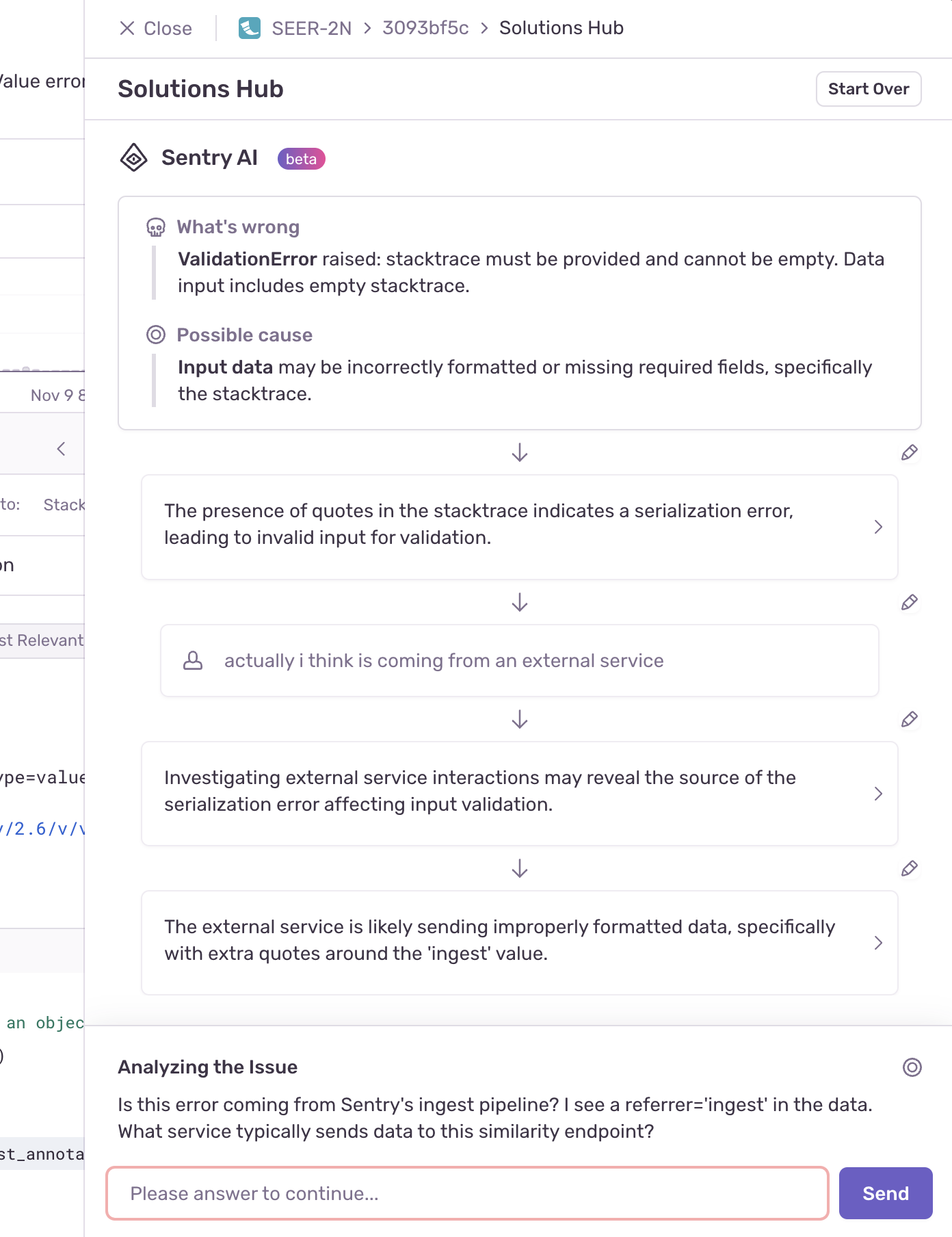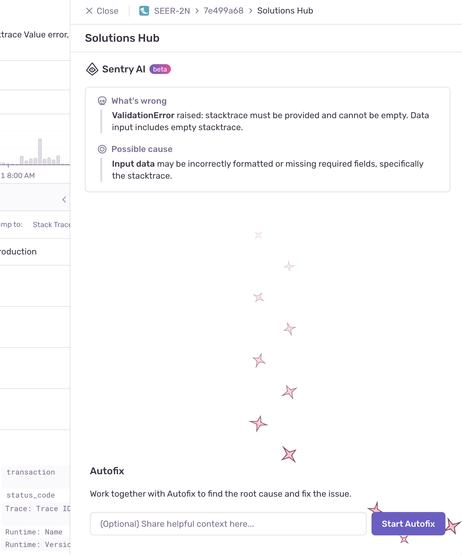 Autofix uses the issue details, your codebase (integrated through GitHub), and its interactions with you to gain context, reason through the problem, and get a deeper understanding of the root cause.