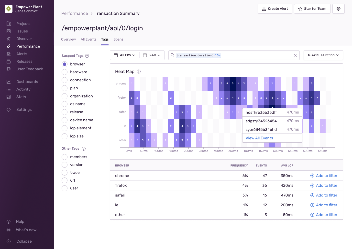 The Tags tab displays a list of suspect tag keys that often correspond to slower transactions. Toggle through them to have the corresponding tag values reflected in the heat map. Similar to a histogram, events are distributed by duration. Click on any purple box to view a list of events or continue to filter down the events by adding values to the filter in the table below the heat map. Use the "X-Axis" dropdown to aggregate the events by transaction duration or by Largest Contentful Paint (LCP).